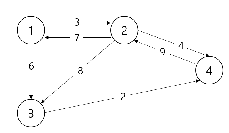 위의 그래프에서 노드에서 다른 노드로 가는 비용을 이차원 배열로 구성하여 표시하면 다음과 같다. 해당 표에서 INF는 특정 노트에서 다른 노드로 가는 길이 없을 경우를 의미하며, 자기자신에게 이동하는 경우에 대한 비용은 0으로 할당한다.